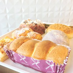 I stopped by here while I was visiting the Stonestown mall and bought a milk tea bun, cheese bread, and lychee green milk tea (large which is 22 oz, iced, 25% sweetness). Milk tea bun: It was actually not that sweet and the custard inside is flavored but it doesn't really taste like tea - it's more like brown sugar if anything. The outside reminds me of walnut bread, which isn't necessarily a bad thing but definitely wasn't what I expected. I personally feel the matcha chocolate bread, which is also sold at this location, is better in terms of the flavor profile. Cheese bread: This was much sweeter than I expected, probably from the custard, and hollow inside so it wasn't as filling or dense as you might expect from the appearance. Not bad, but it just wasn't as salty as I thought it'd be Lychee green milk tea: 25% sweetness actually makes it not sweet so you can taste the tea. But I felt the milk ratio was a bit higher and wish the tea was a little stronger overall so that it would taste fruitier and more fragrant. Overall I thought the food was decent and the drink prices are pretty good for the size. There's a current buy one get one 50% off deal for the strawberry festival which consists of three limited edition seasonal strawberry-focused drinks. The shop is rather small, but they made efficient use of the space to have a decent array of breads available. They have a sign showing the sizes of drink cups toward the pickup side of the counter. There's not much indoor seating, but there are outdoor tables, although some are a little rickety and/or have bird poop or other messes on them.